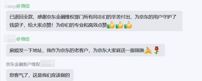 “已退回全款,感谢京东金融维权部门所有们的辛苦付出,为京东的用户守护了钱袋子,给大家点赞!为你们的专业和高效点赞。”张先生在赠旗时表示,“此前遭遇诈骗后焦虑万分,是京东金融的工作人员始终耐心沟通、高效推进,用专业服务帮我走出困境,由衷表示感谢。感谢京东科技团队的兄弟们,维护用户合法权益,辛苦您了!预祝大家新年快乐!”
